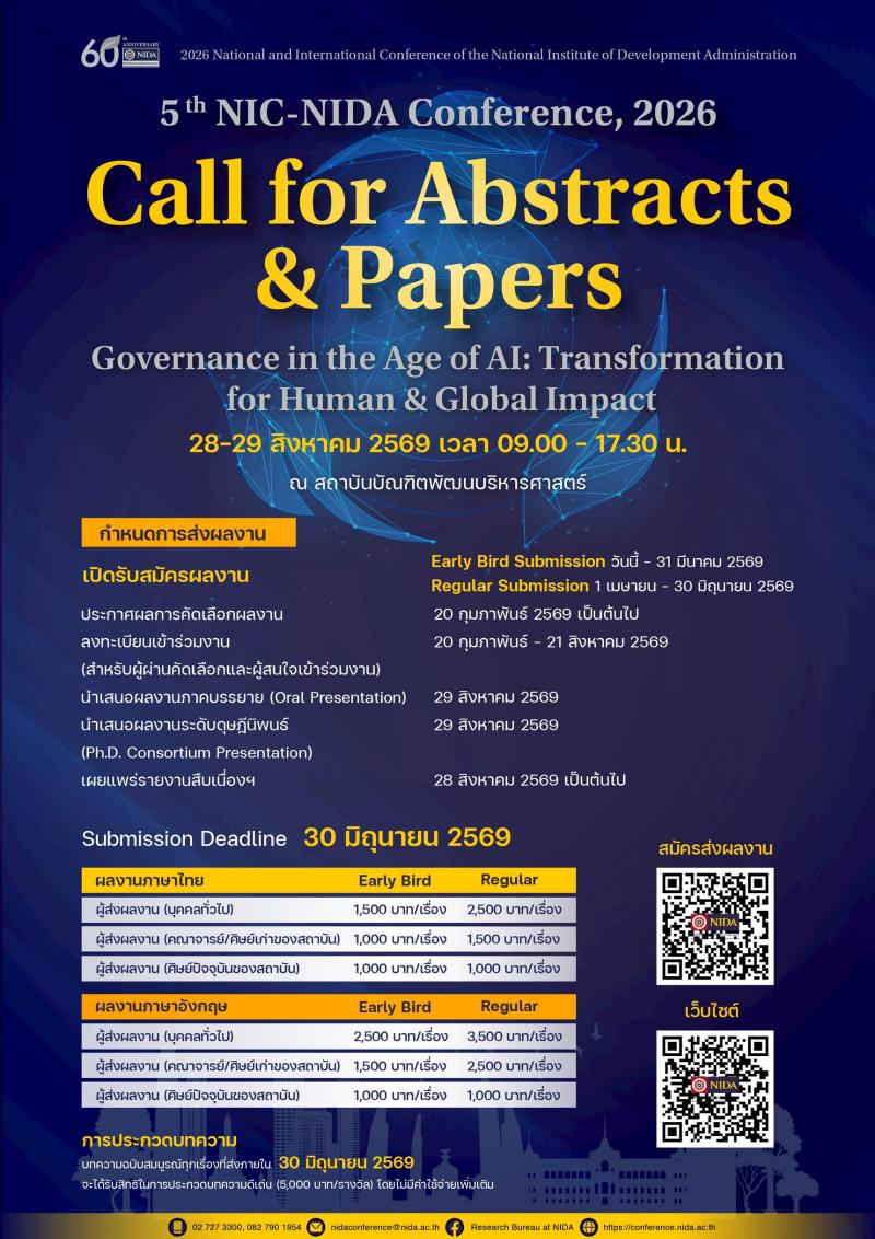 สถาบันบัณฑิตพัฒนบริหารศาสตร์ (NIDA) ขอเชิญส่งบทคัดย่อ/บทความวิชาการ (Call for Papers: Abstracts and Full Papers) เพื่อนำเสนอในงานประชุมวิชาการระดับชาติและนานาชาติ ประจำปี 2569 2026 National and International Conference of the National Institute of Development Administration 5th NIC-NIDA Conference, 2026 Theme: Governance in the Age of AI: Transformation for Human & Global Impact (พลิกโฉมการกำกับดูแลในยุค AI เพื่อพัฒนามนุษย์และสังคมโลก)