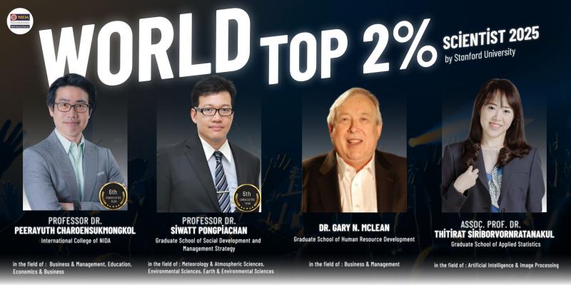 สำนักวิจัย สถาบันบัณฑิตพัฒนบริหารศาสตร์ ขอแสดงความยินดีอย่างสุดซึ้งกับคณาจารย์ที่ได้รับการบรรจุอยู่ในรายชื่อ “Top 2% Scientists of the World 2025” โดยสแตนฟอร์ดมหาวิทยาลัย ซึ่งเป็นการยืนยันว่าสถาบันของเราได้สร้างสรรค์ผลงานวิจัยระดับโลกอย่างต่อเนื่องและยั่งยืน