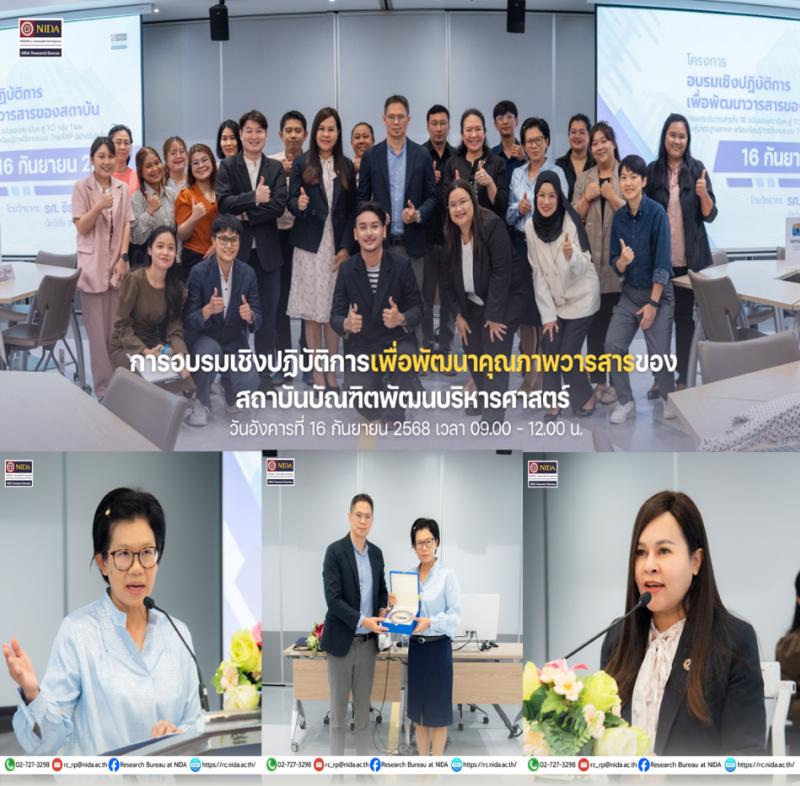 สำนักวิจัย สถาบันบัณฑิตพัฒนบริหารศาสตร์ (NIDA) จัดการอบรมเชิงปฏิบัติการ “การพัฒนาคุณภาพวารสารของสถาบันบัณฑิตพัฒนบริหารศาสตร์” เมื่อวันอังคารที่ 16 กันยายน 2568 เวลา 09.00 – 12.00 น. ณ ห้อง 603–604 ชั้น 6 อาคารสยามบรมราชกุมารี