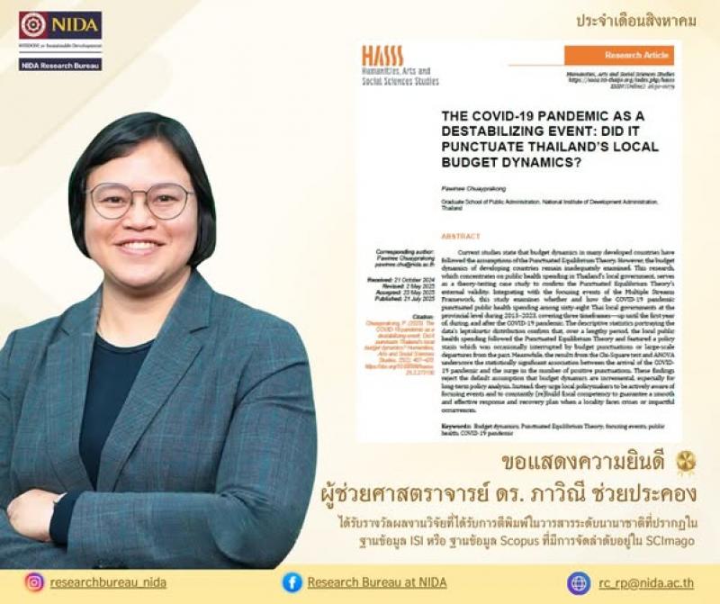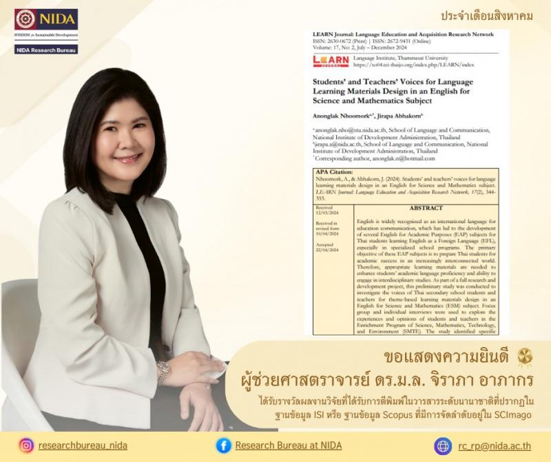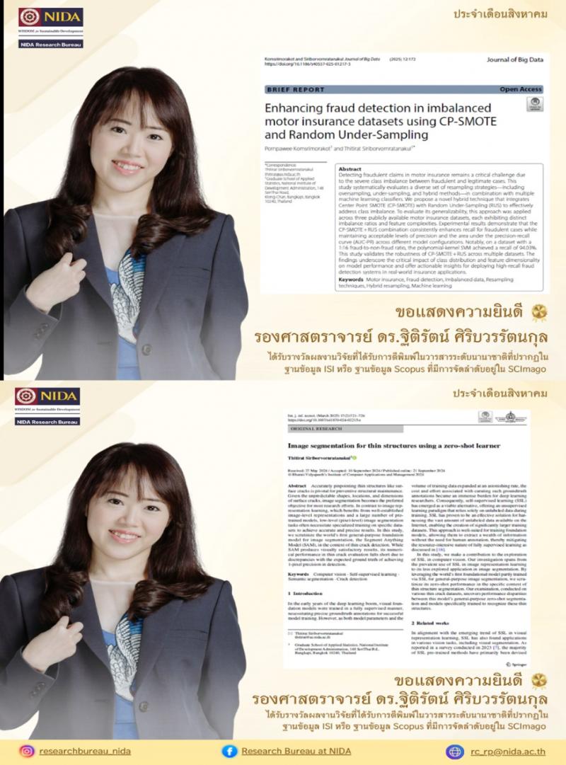 ความเป็นเลิศทางวิชาการและความทุ่มเทในการพัฒนางานวิจัยของคณาจารย์ NIDA นี้แสดงให้เห็นถึงความสำเร็จ ซึ่งจะเป็นแรงผลักดันให้องค์ความรู้ใหม่ๆ ก้าวสู่ระดับสากล ขณะเดียวกัน ขอแสดงความยินดีและให้กำลังใจแก่ทุกท่านนักวิจัยในการเดินหน้าพัฒนางานวิจัยสู่เวทีโลกต่อไป!