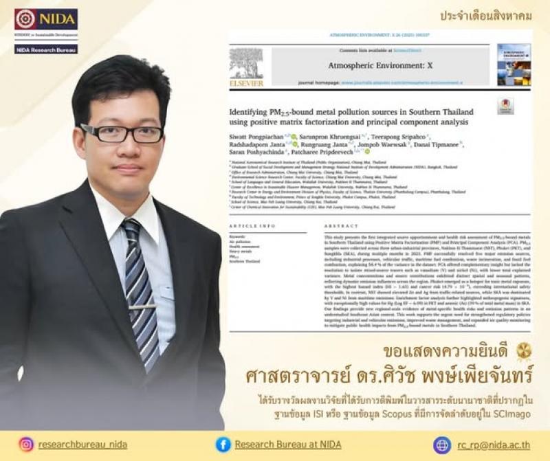 เรื่อง “Identifying PM2.5-bound metal pollution sources in Southern Thailand using positive matrix factorization and principle component analysis” April 2025Atmospheric Environment X 26(24):100337 https://doi.org/10.1016/j.aeaoa.2025.100337 ได้รับการตีพิมพ์ใน Atmospheric Environment X สำนักพิมพ์ Elsevier Ltd อยู่ในฐานข้อมูล Scopus และจัดลำดับอยู่ใน SCImago ควอไทล์ที่ 1