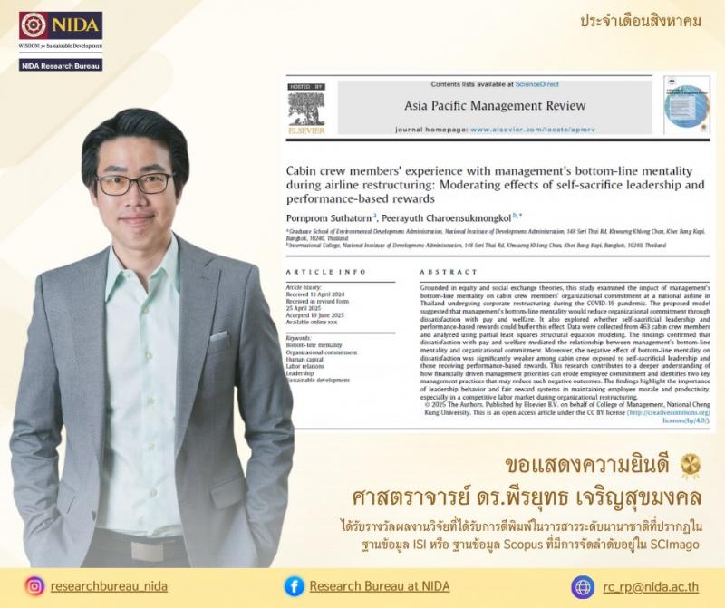 เรื่อง “Cabin crew members' experience with management's bottom-line mentality during airline restructuring: Moderating effects of self-sacrifice leadership and performance-based rewards” https://doi.org/10.1016/j.apmrv.2025.100382 ได้รับการตีพิมพ์ใน Asia Pacific Management Review สำนักพิมพ์ National Cheng Kung University อยู่ในฐานข้อมูล Scopus และจัดลำดับอยู่ใน SCImago ควอไทล์ที่ 1